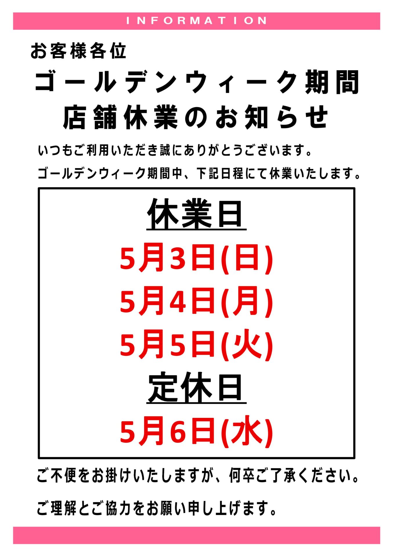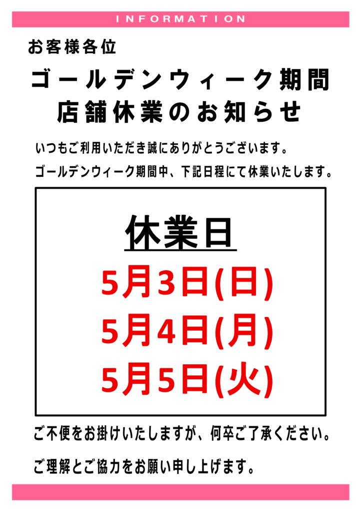 GWの休業日について 平素より格別のご愛顧を賜り心より感謝申し上げます。 誠に勝手ではございますが下記の日程において休業いたしますのでよろしくお願い申し上げます。皆様にはご不便をおかけいたしますが何卒ご理解いただけますようお願い申し上げます。 【下越地区】 ※木曜日定休日(ウオロク新津店除く) 【中越地区(長岡市・三条市・燕市)】