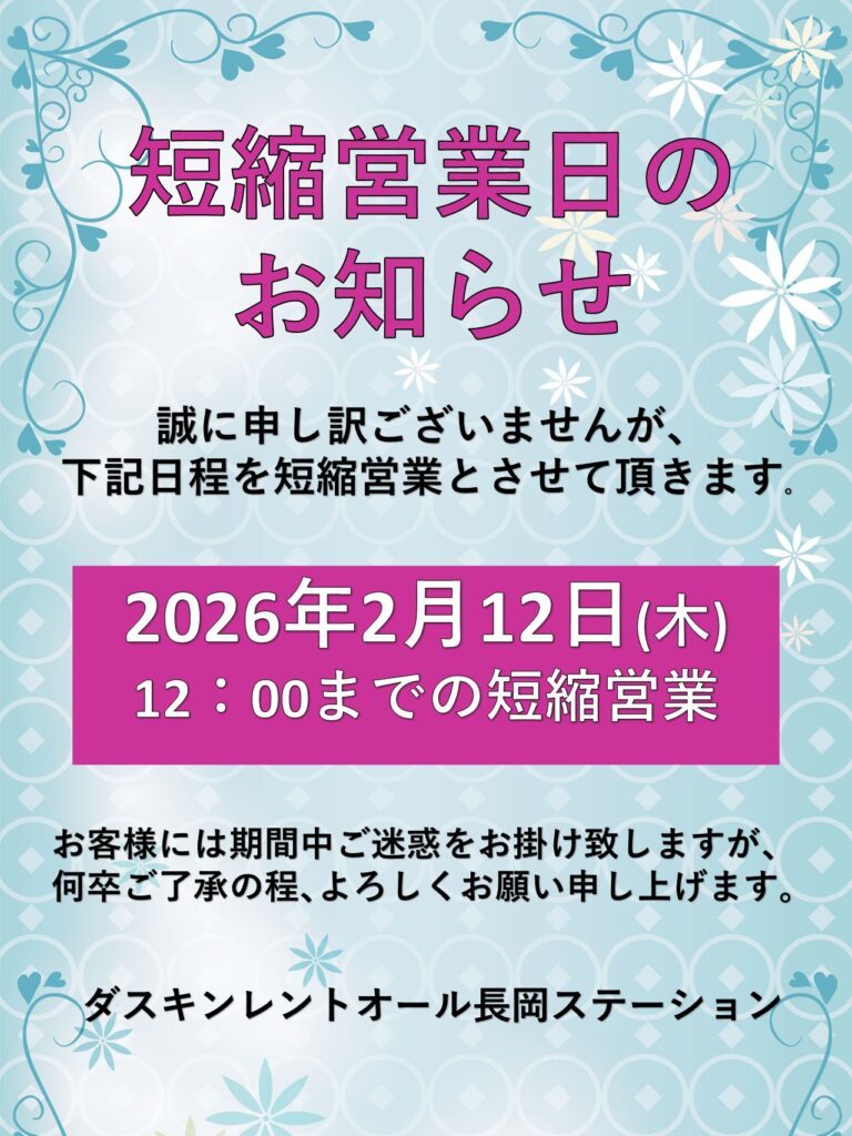 日頃より、ダスキンレントオール長岡ステーションをご利用いただきまして、ありがとうございます。 誠に勝手ながら、社内研修のため、2026年2月12日(木)は9時〜12時までの営業とさせて頂きます。尚、2026年2月13日(金)より通常営業を開始いたします。ご迷惑をおかけいたしますが、何卒宜しくお願い申し上げます。