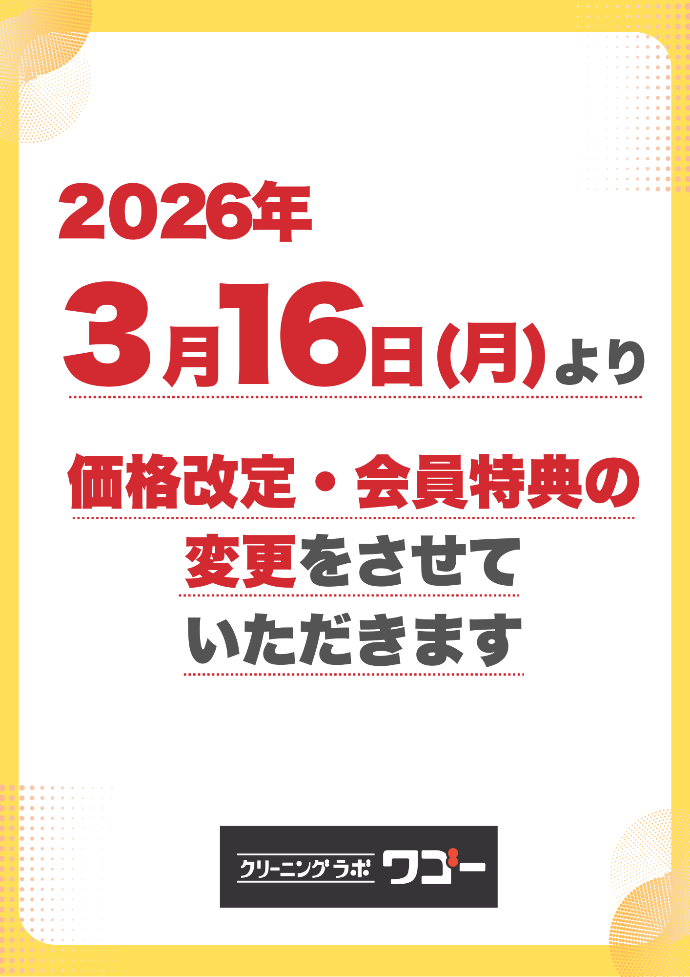 日頃より当店をご利用いただき誠にありがとうございます。 2026年3月16日(月)よりクリーニング代金の価格改改定と会員特典の変更を行います。 今後とも、お客様にご満足いただける品質の提供と、更なるサービスの向上に努めて参ります。 何卒ご理解賜りますようお願い申し上げます。